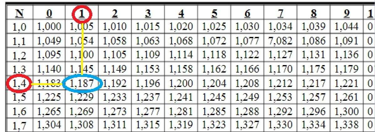 Tại giao của hàng 1,4 và cột 1 ta thấy số 1,187