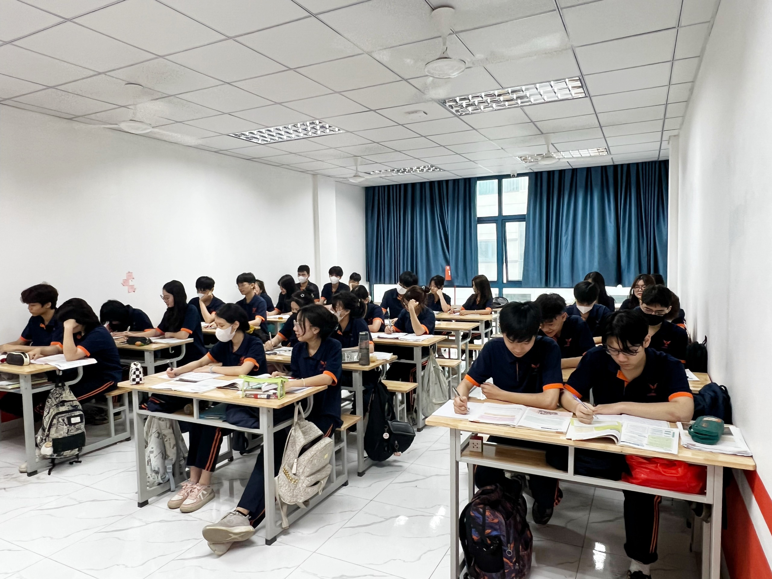 Phòng học rộng rãi được trang bị đầy đủ ánh sáng, bàn ghế, tủ sách học tập, tivi 65 inch và bảng kéo. Ngoài ra 100% các phòng học đều được trang bị điều hòa. Đảm bảo cho học sinh có những giờ học hiệu quả.