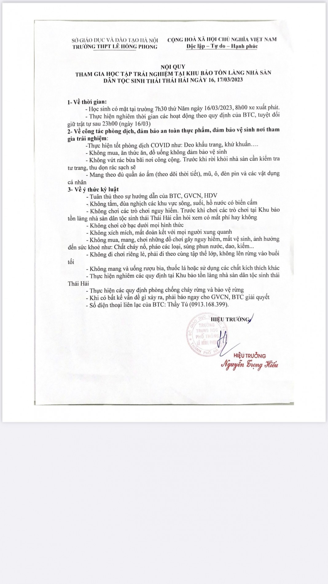 Trường THPT Lê Hồng Phong thông báo tới toàn thể CBGVNV, quý phụ huynh và học sinh trường THPT Lê Hồng Phong chương trình hoạt động trải nghiệm tại khu sinh thái Thái Hải năm 2023 của trường THPT Lê Hồng Phong.